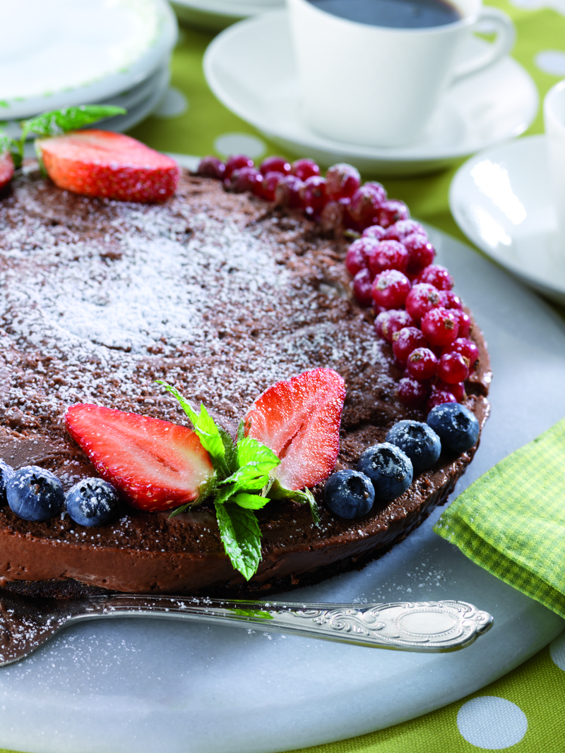 Pistachios, almonds, and coconut form the simple crust, which gets filled with a luscious chocolate mousse.